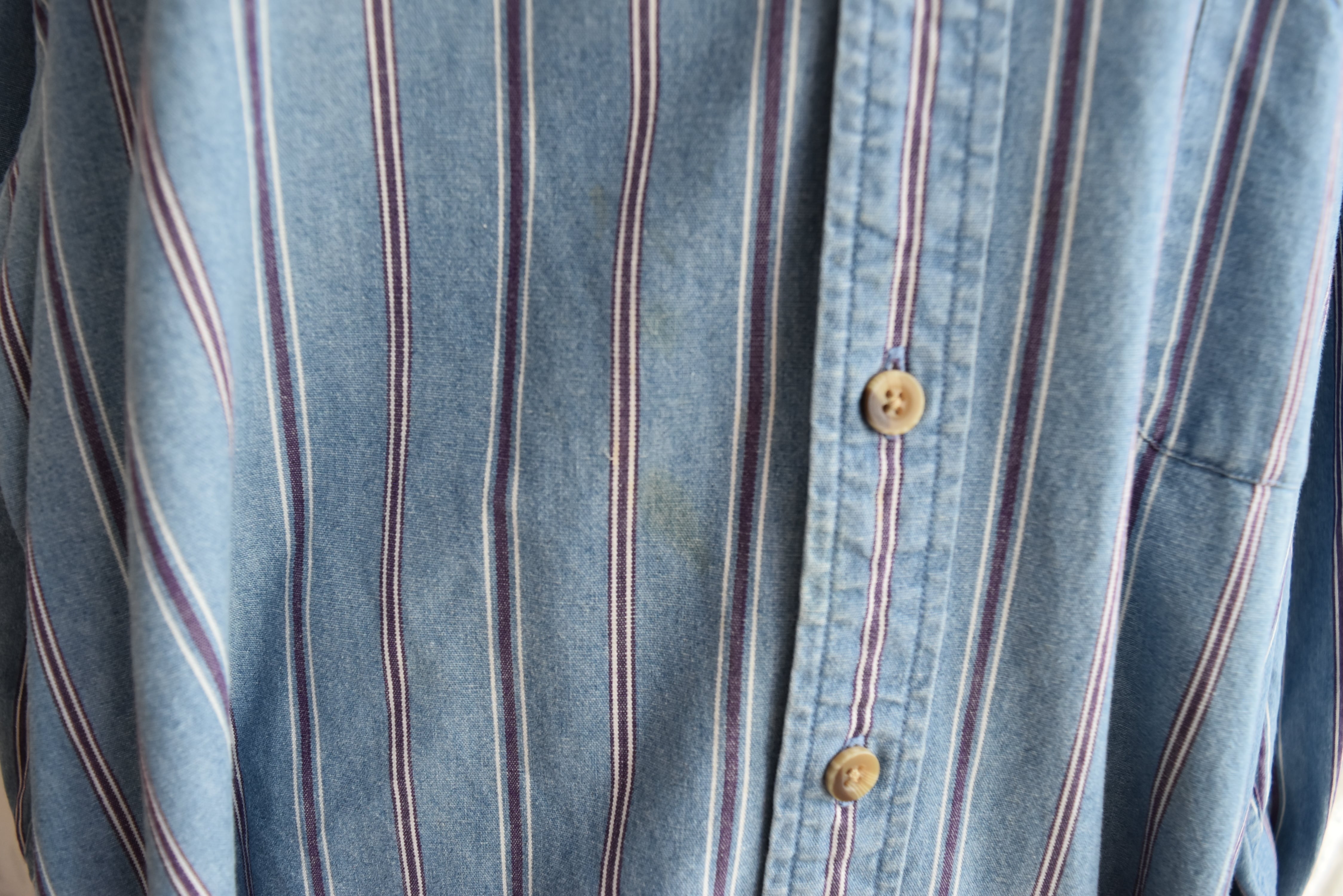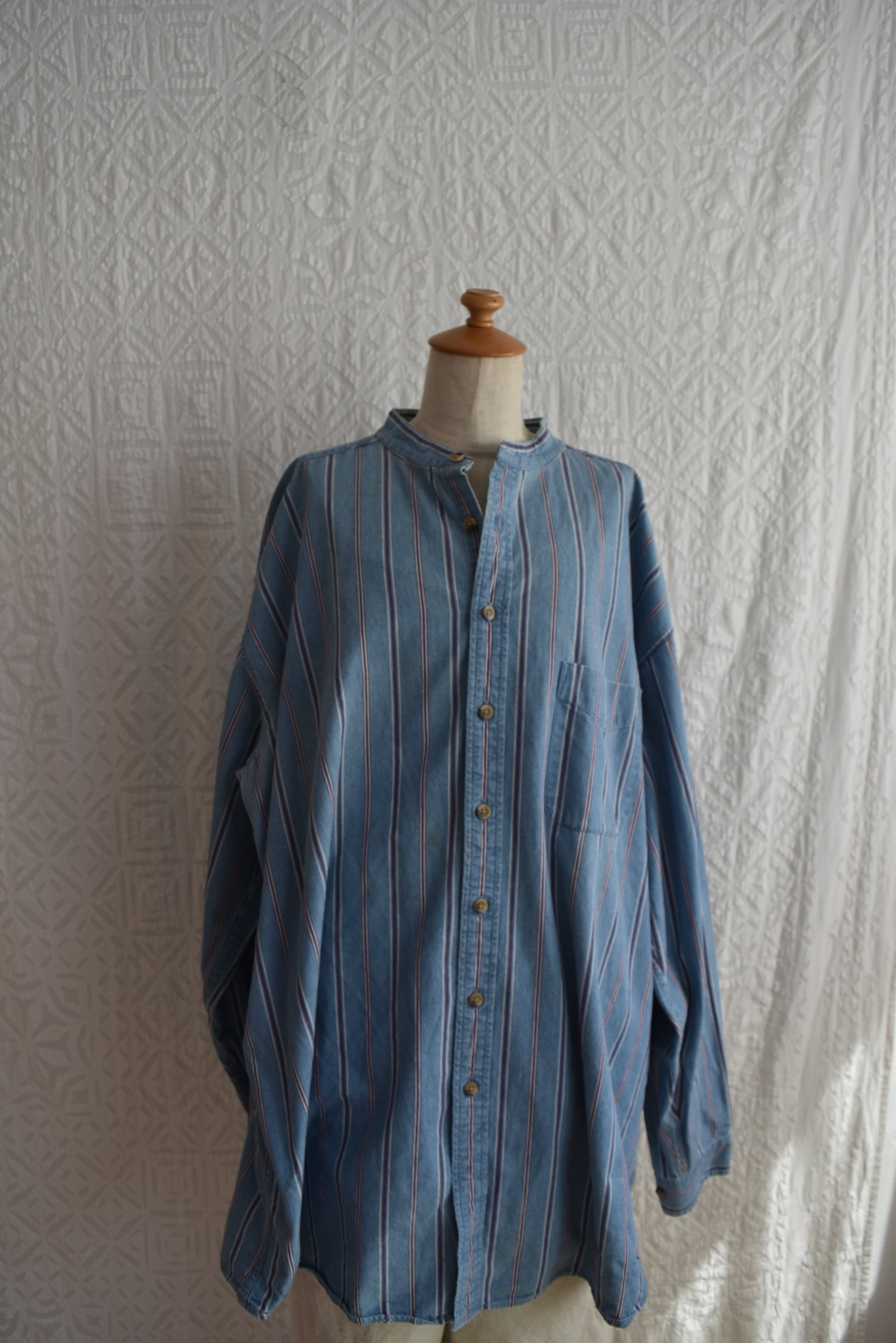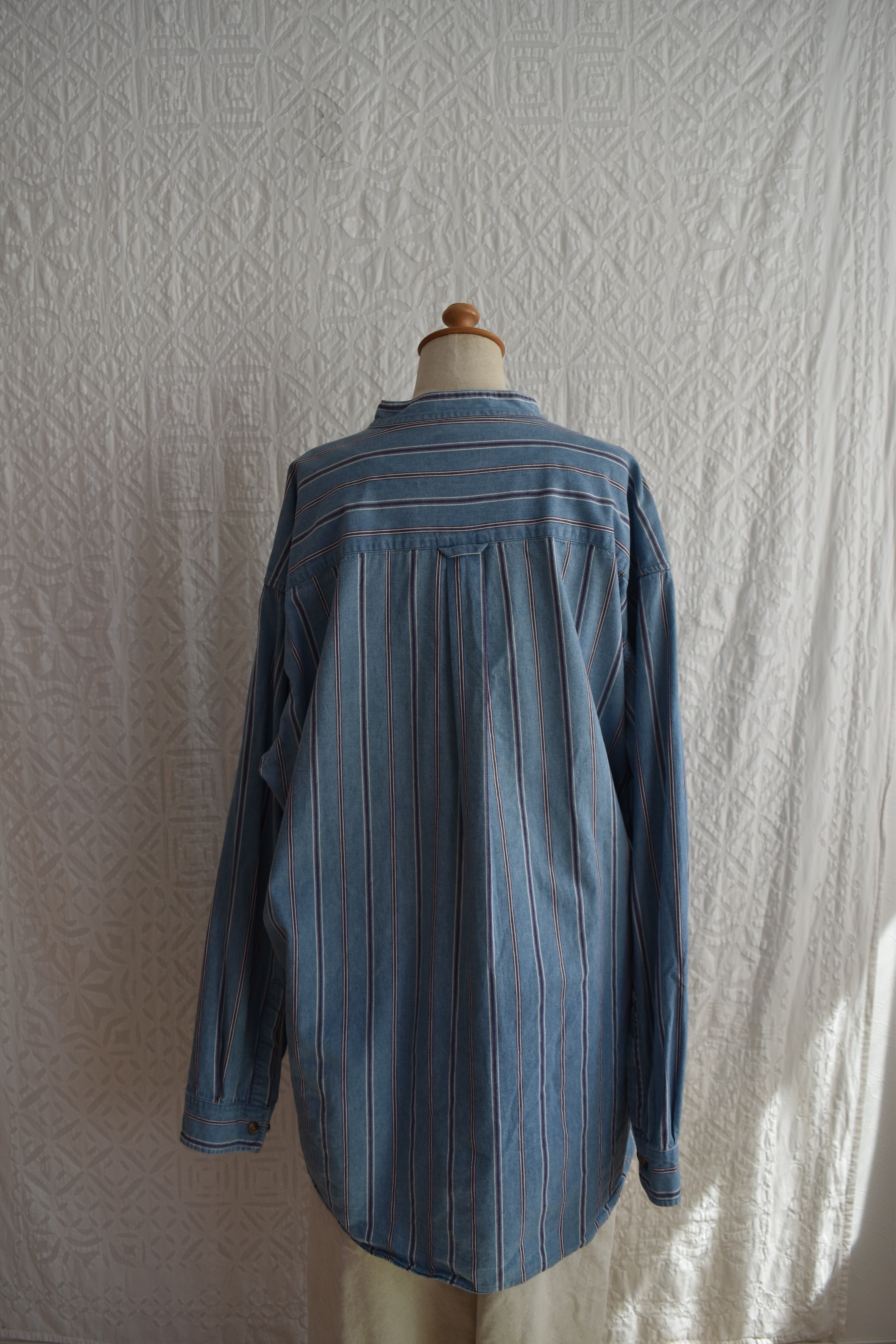 ノーカラーでオーバーサイズのデニムシャツ。秋冬はロングブーツと合わせるのが気分です!デニムにパープルのラインが可愛いです◎