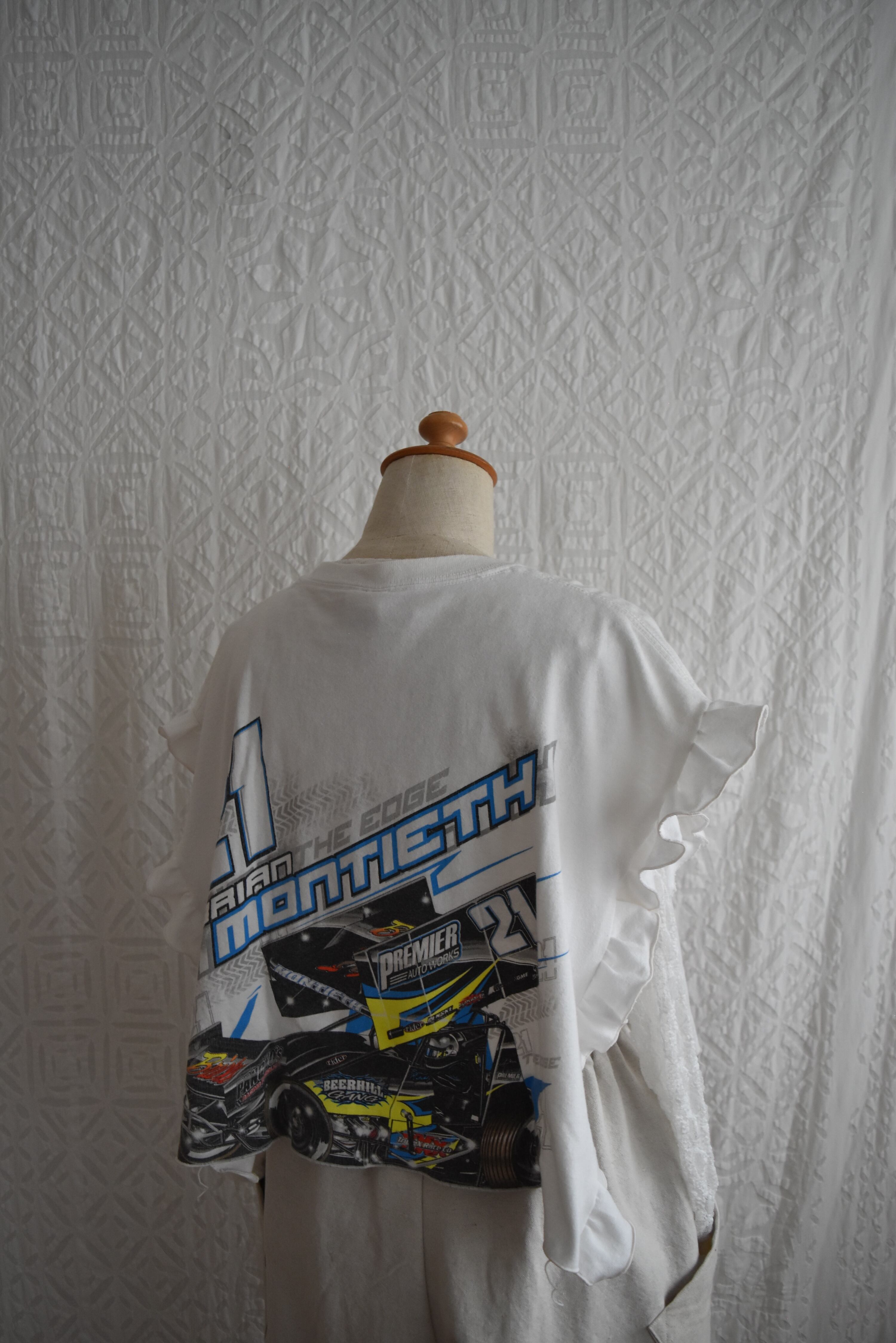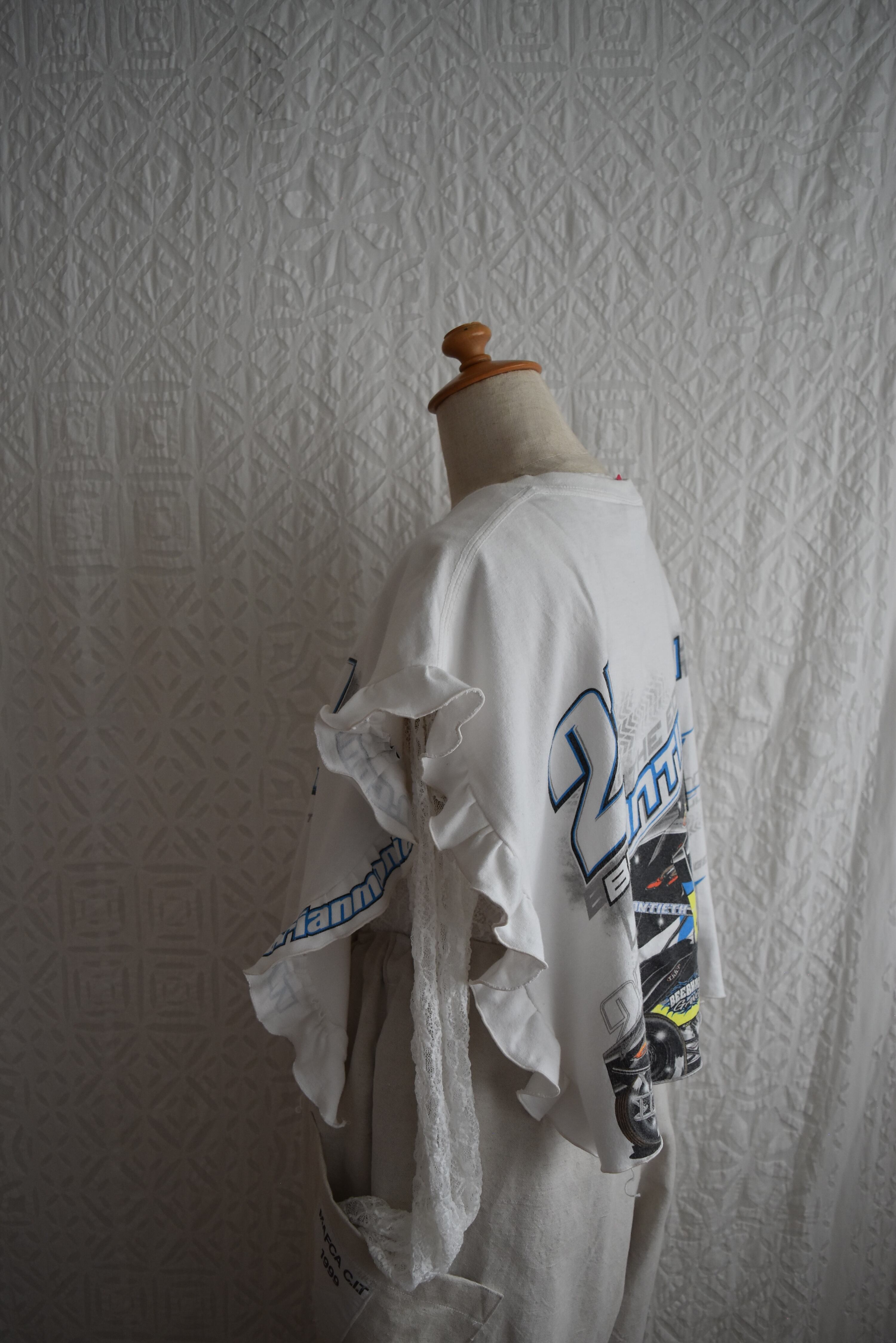 デザインが可愛い古着Tをリメイクしてアップデート!フリルとショート丈、サイドはオープン状態なのでレイヤードにオススメなアイテムもなります◎