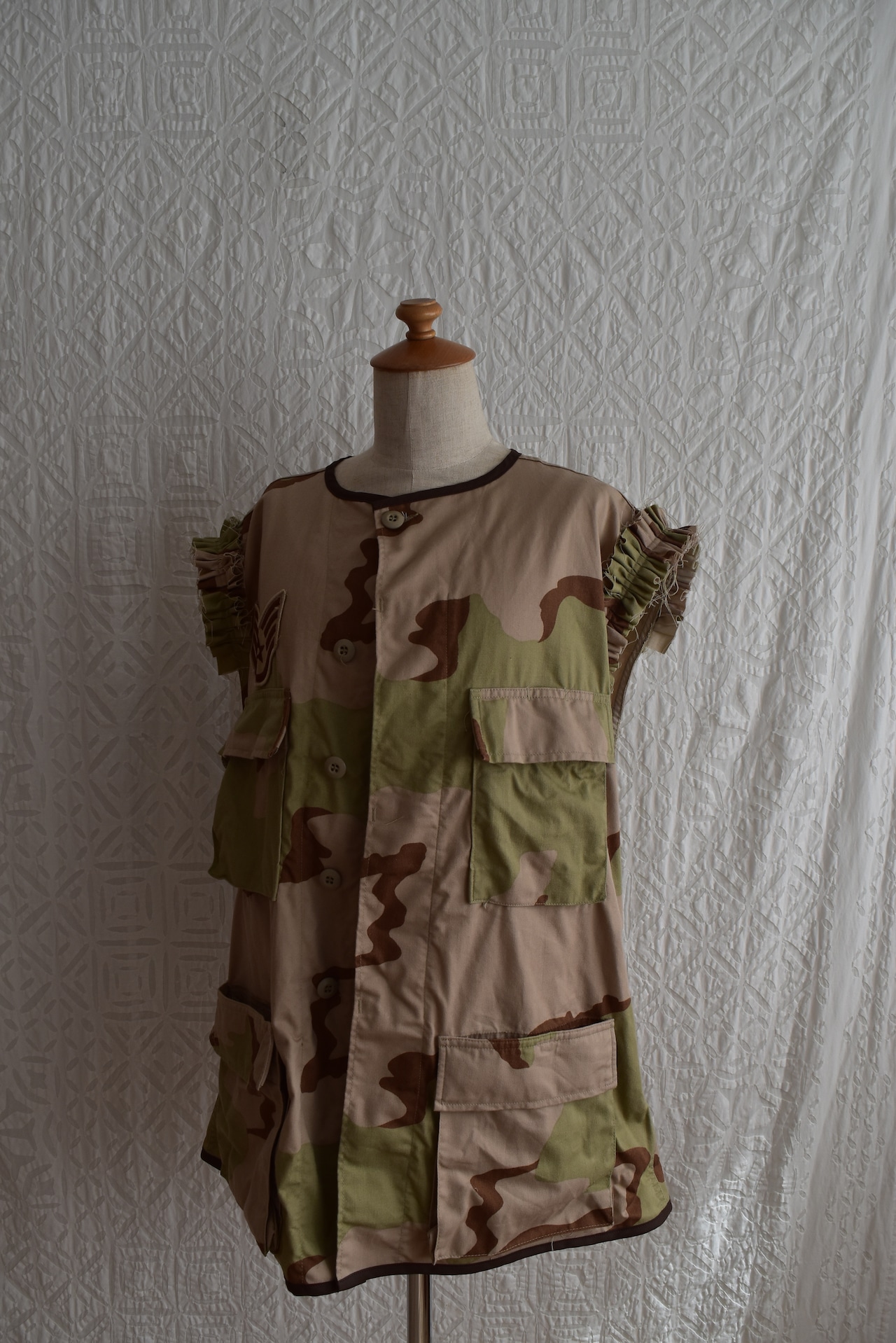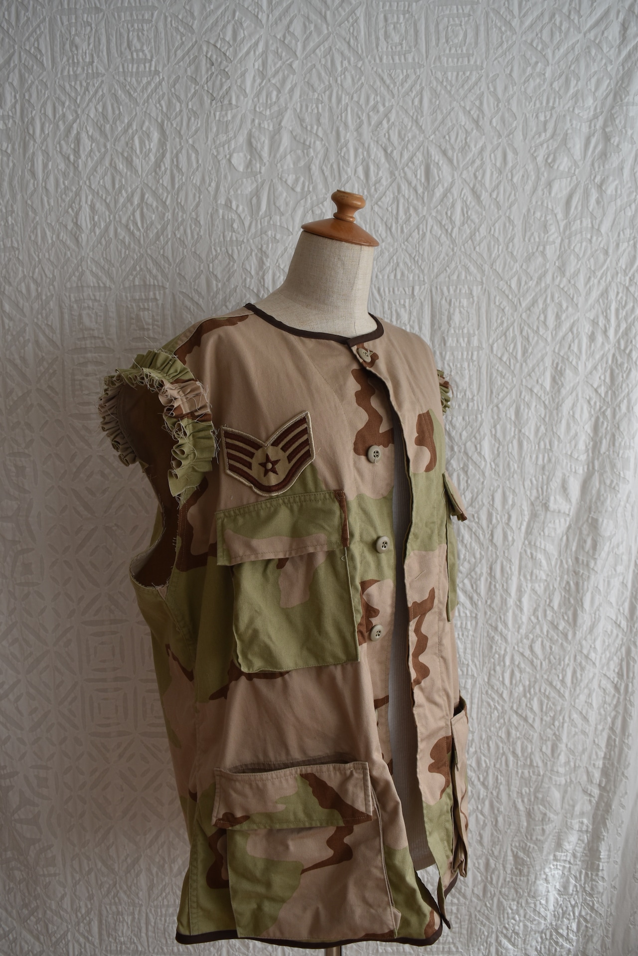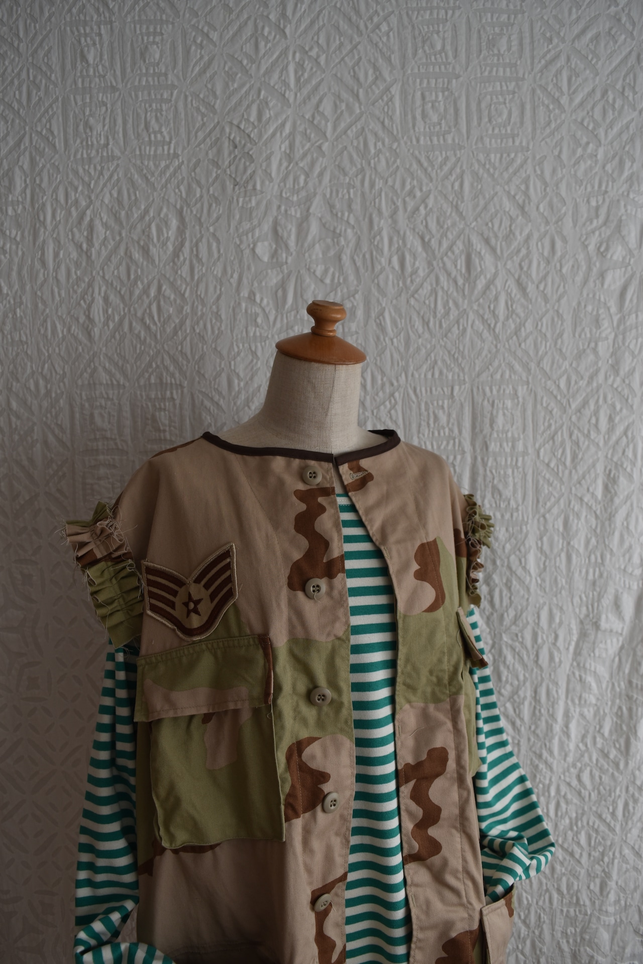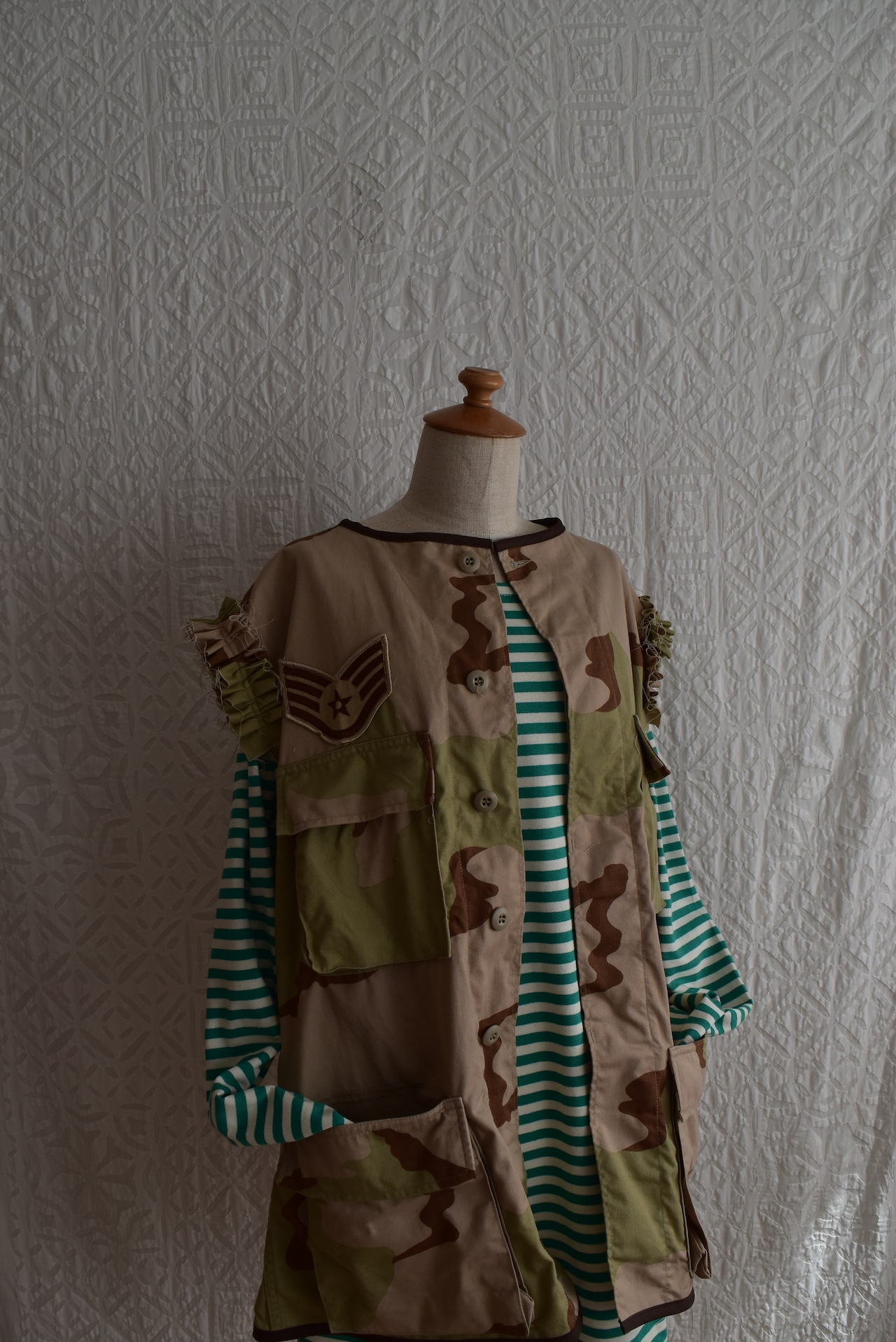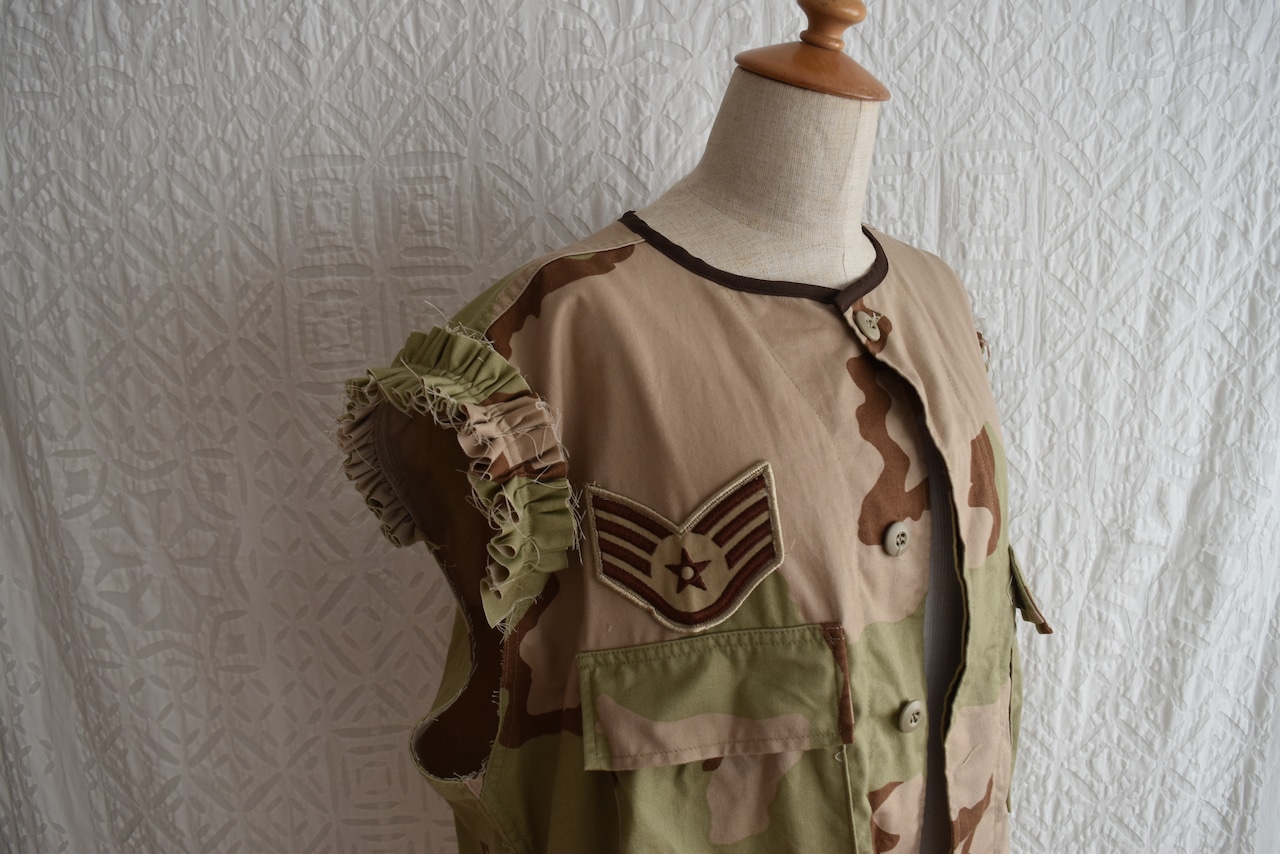 ミリタリージャケットのリメイクシリーズ、ベストからロングバージョンが登場!ジレのような使い方ができるベストとなっております◎