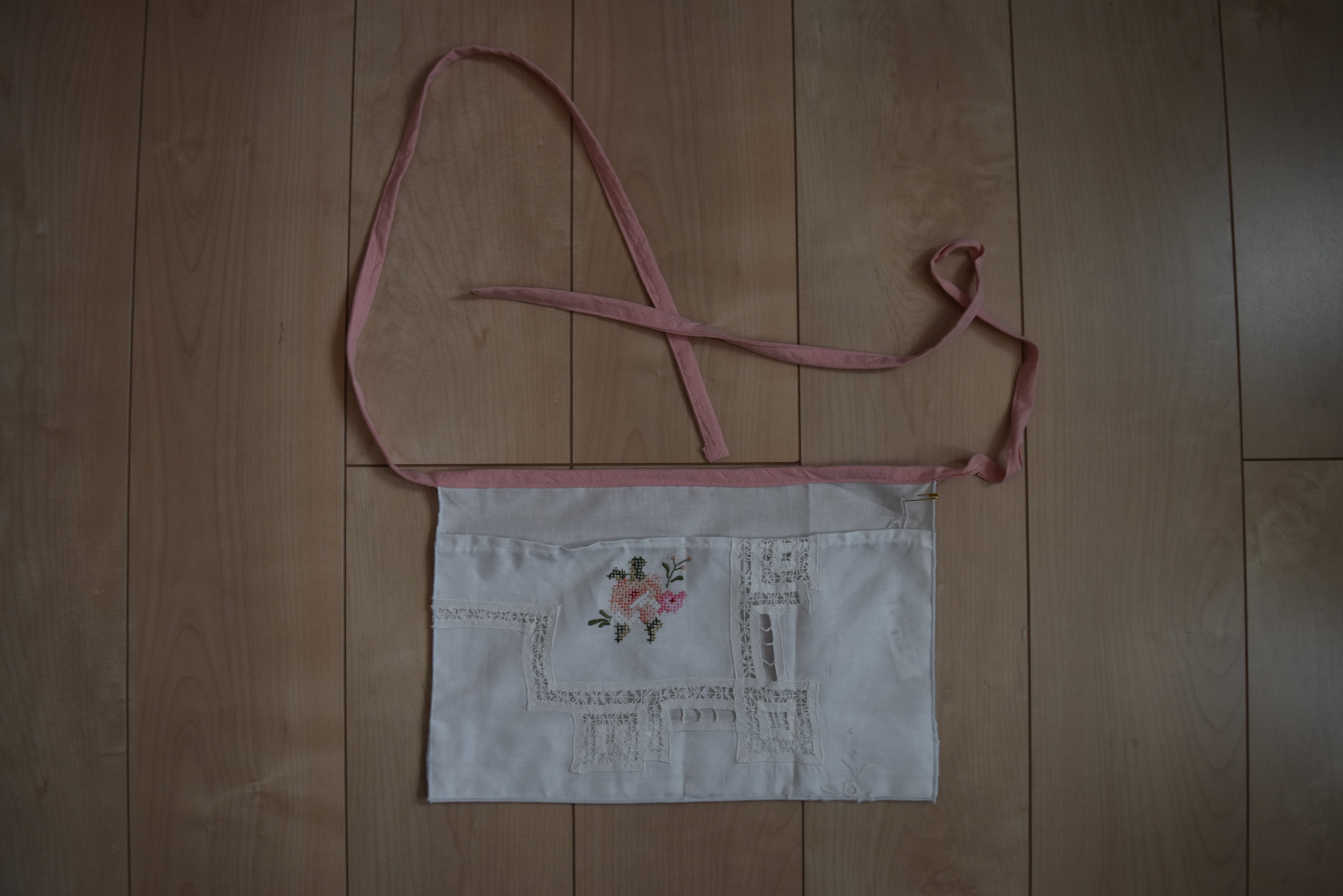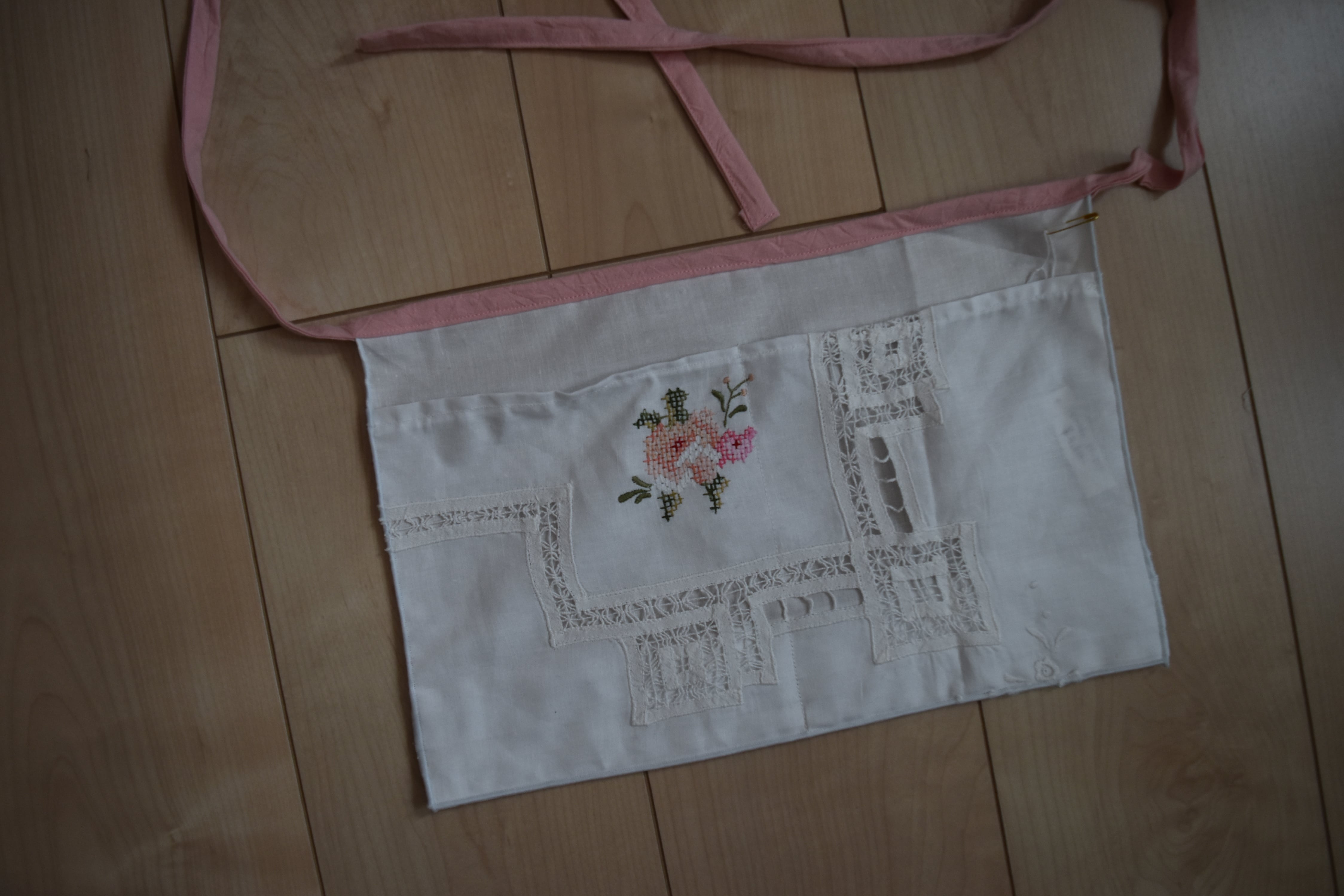 刺繍やレースが可愛いテーブルクロスをリメイクしたポケットエプロン。