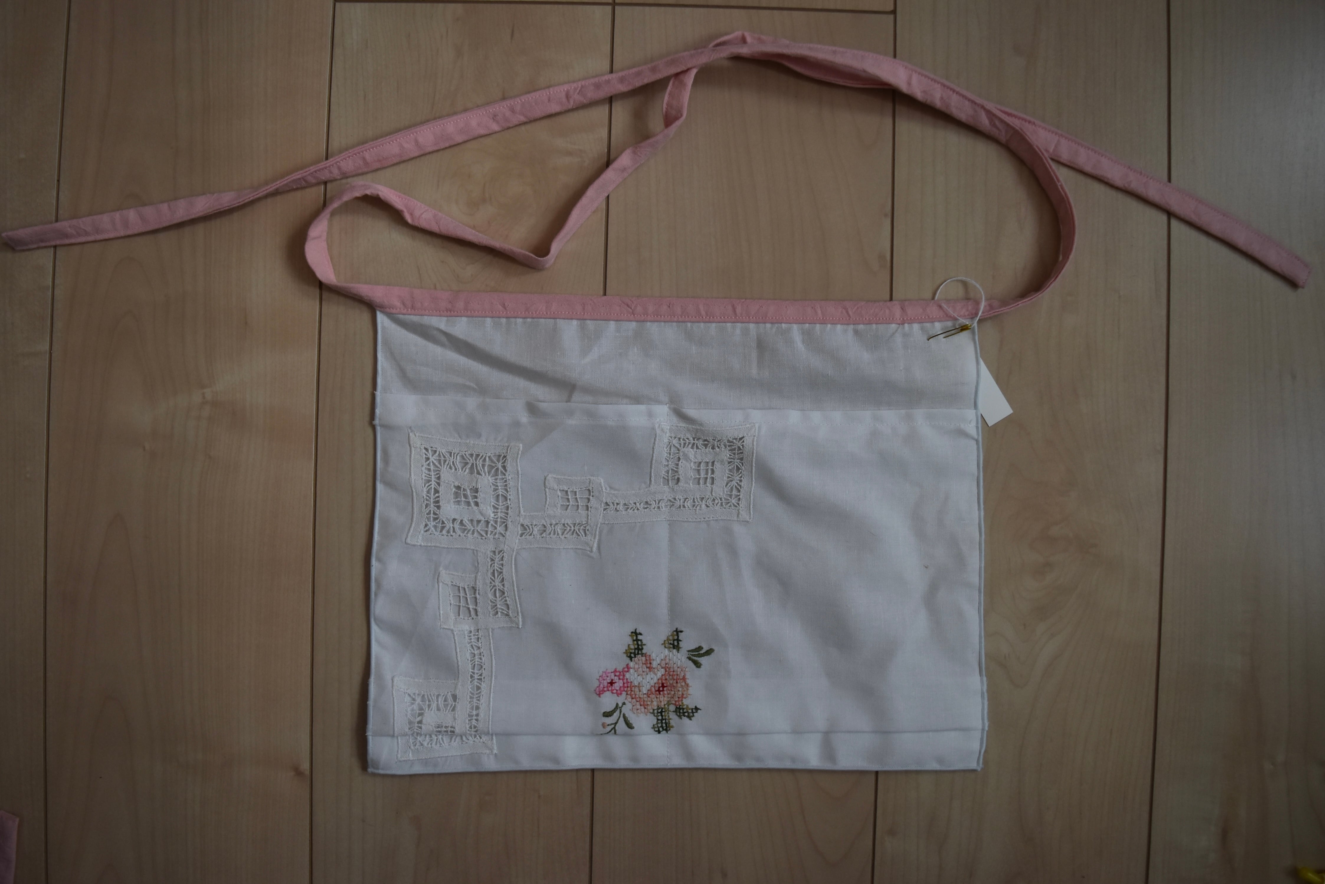 刺繍やレースが可愛いテーブルクロスをリメイクしたポケットエプロン。