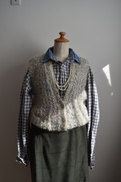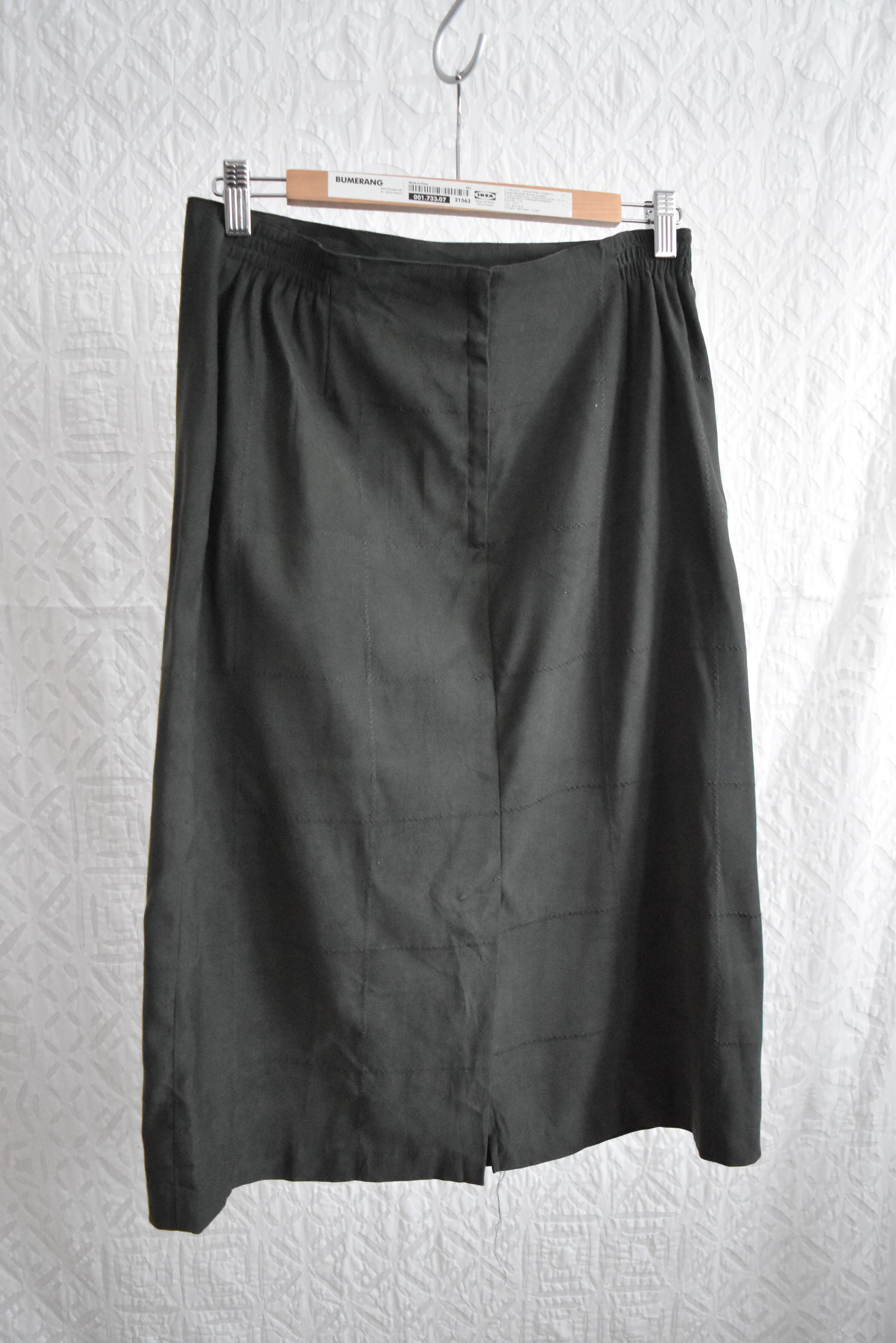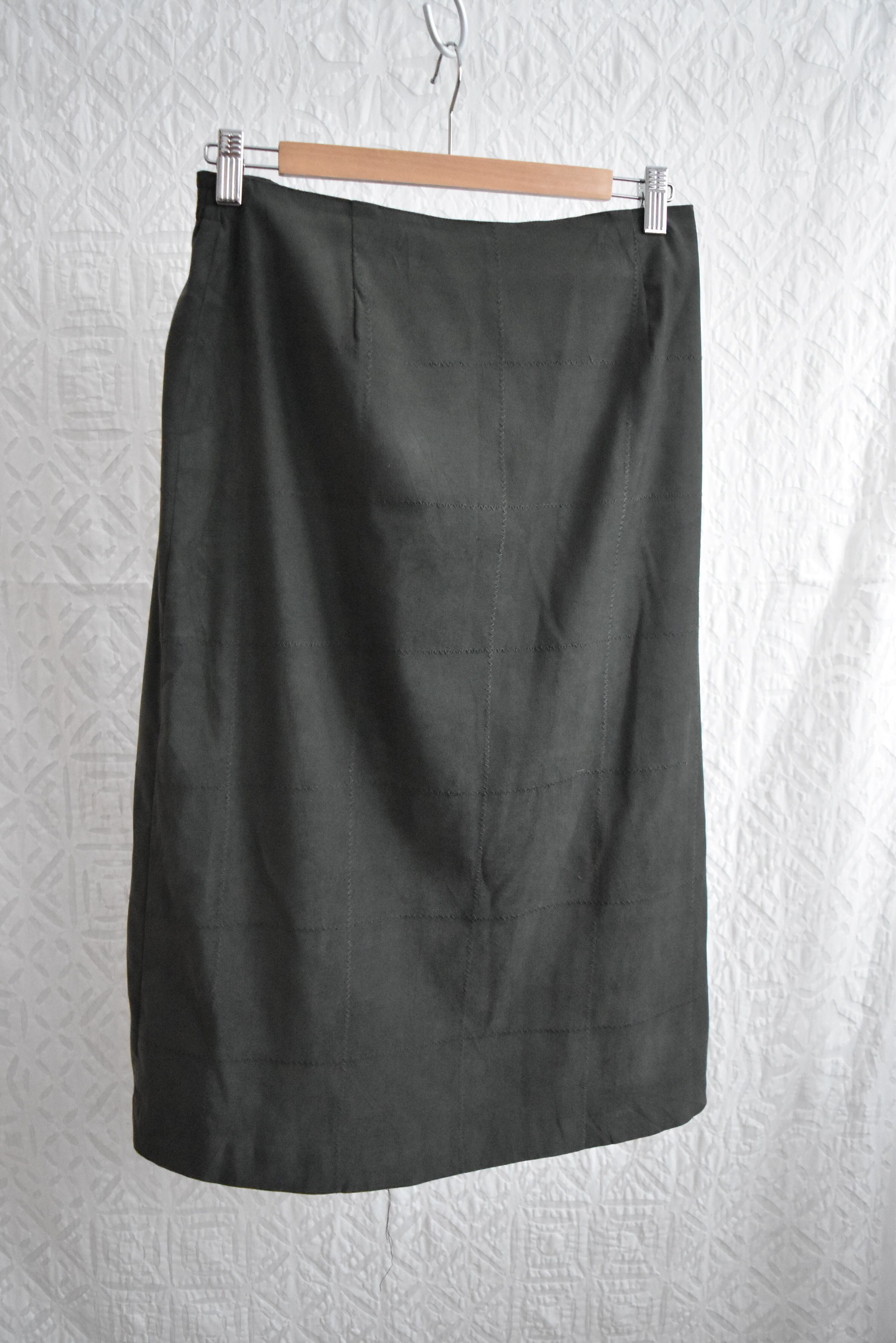 パッチワークのような模様が入っているカーキのスカート。カレッジスウェットなどカジュアルなアイテムやブーツと合わせたくなる一枚です◎