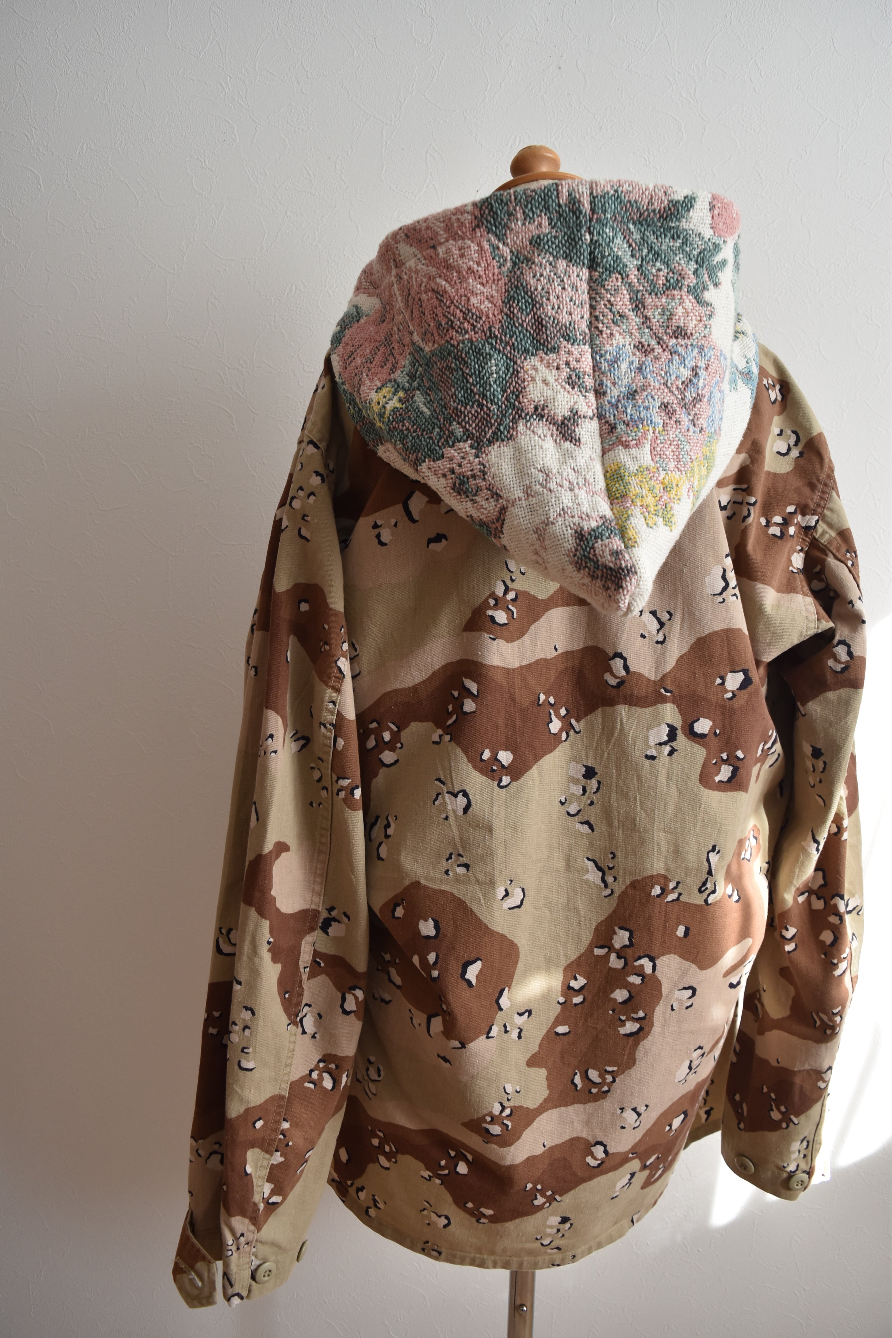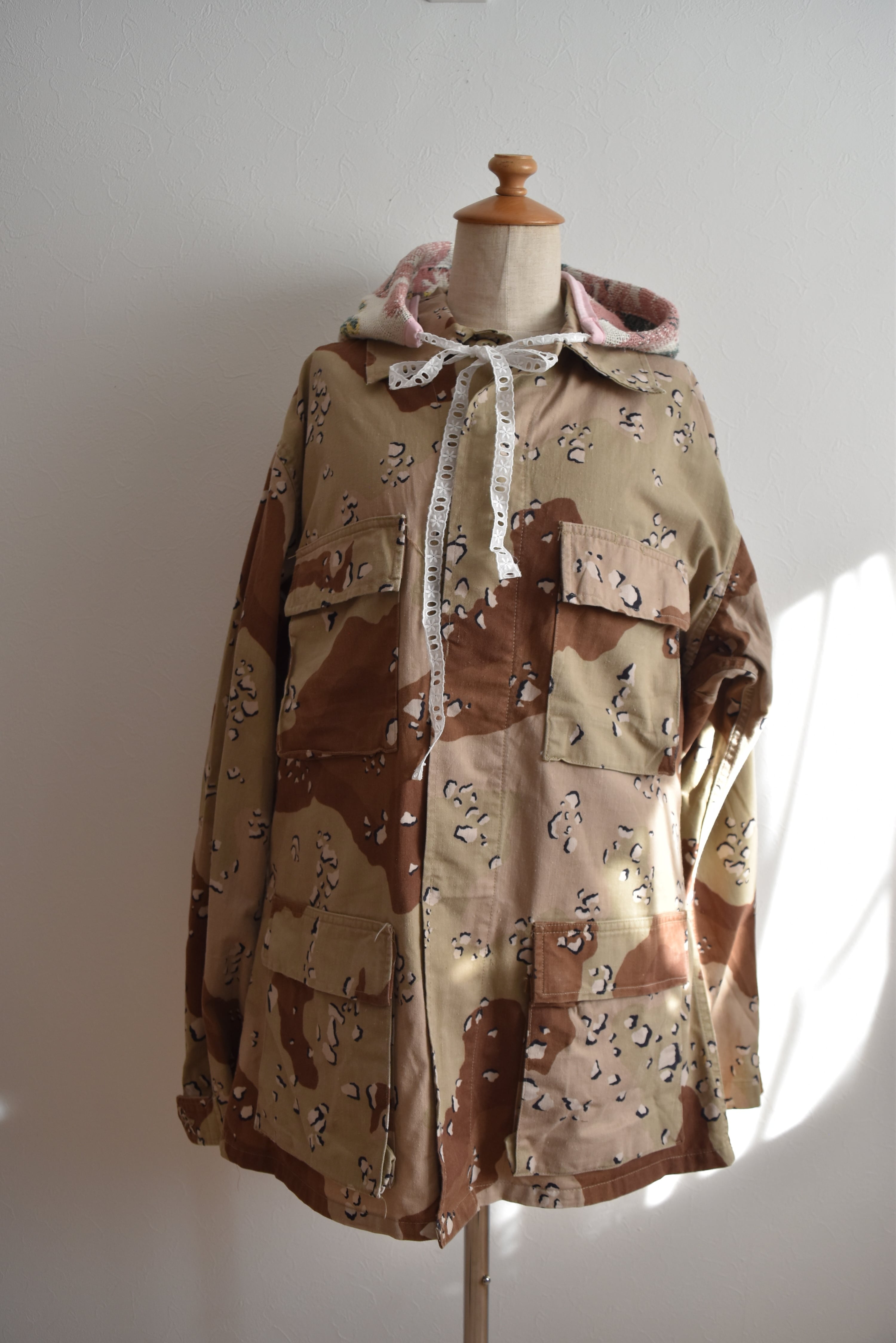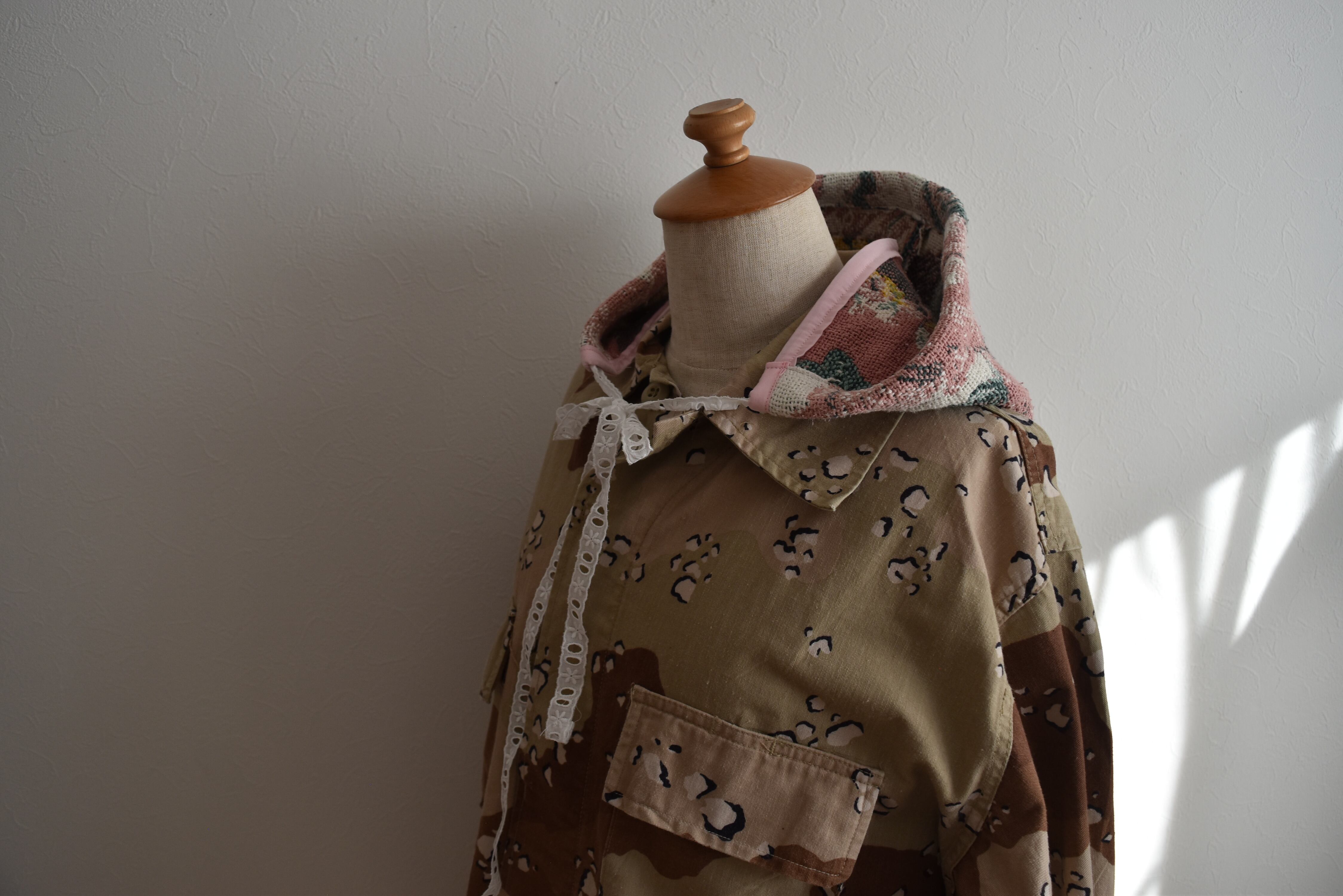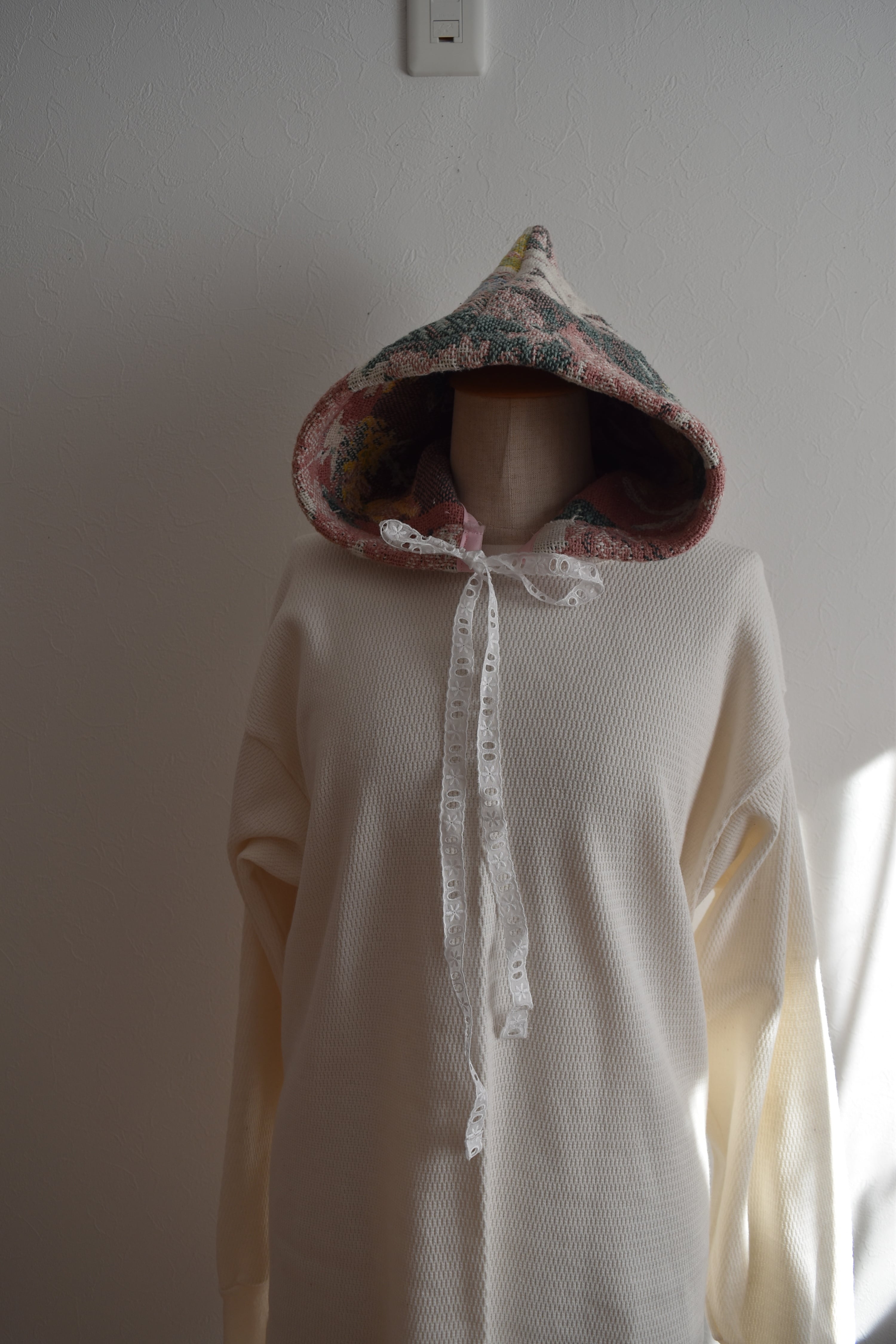 ラグをリメイクして製作した付けフード。シンプルにスウェットなどにプラスワンアイテムとしてオススメです◎