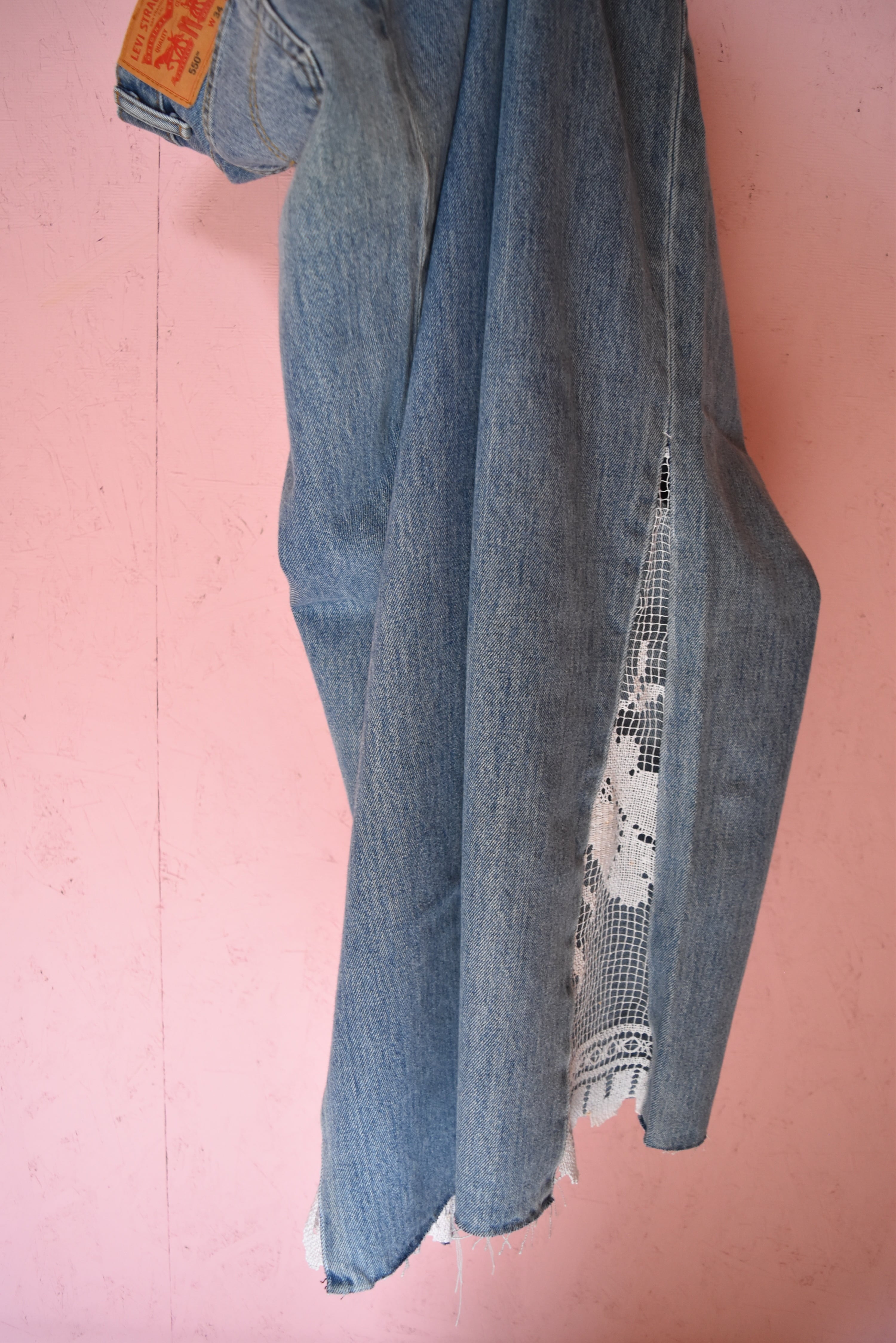 ストレートシルエットのデニムにクロシェをプラスして、少しフレアな感じに◎