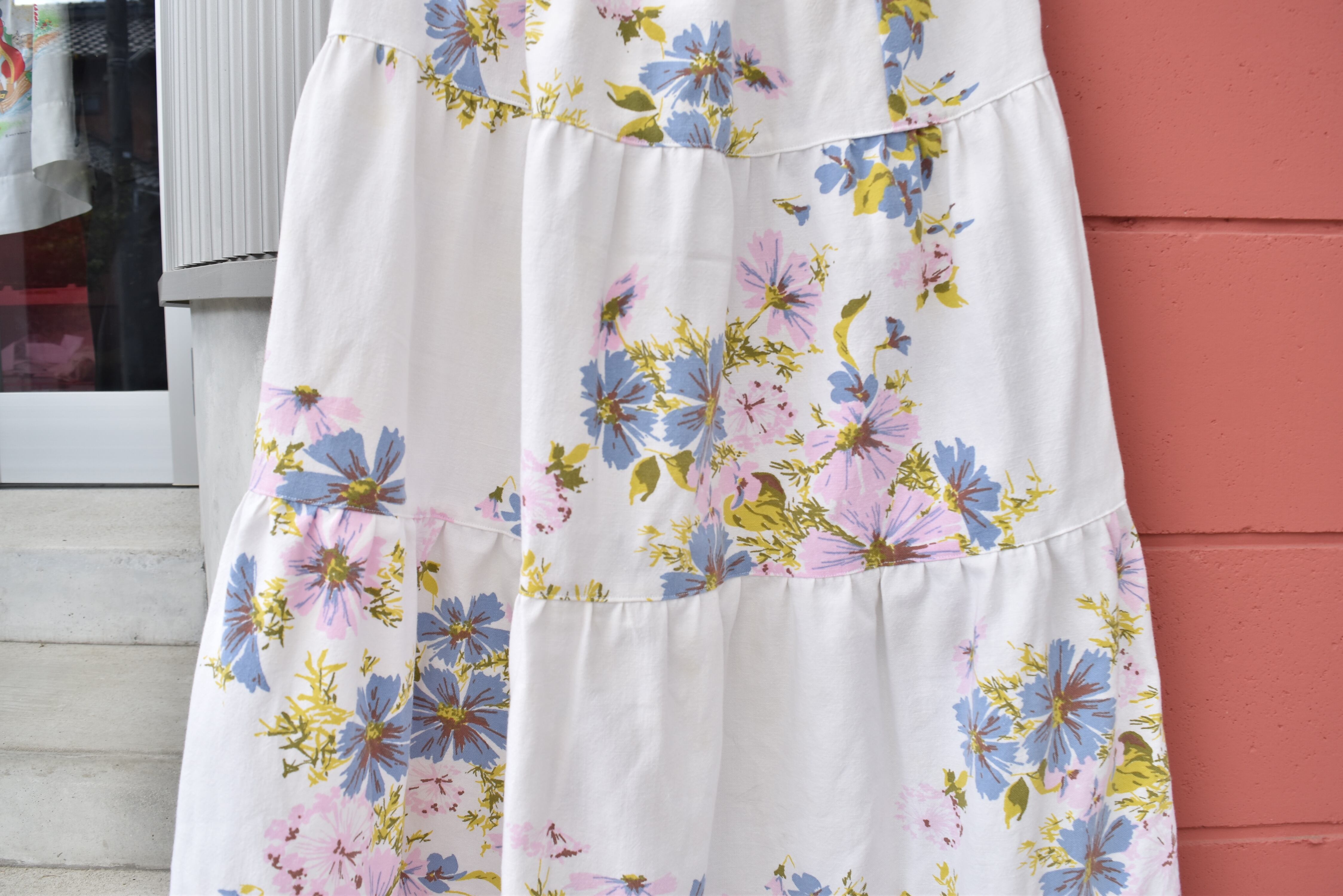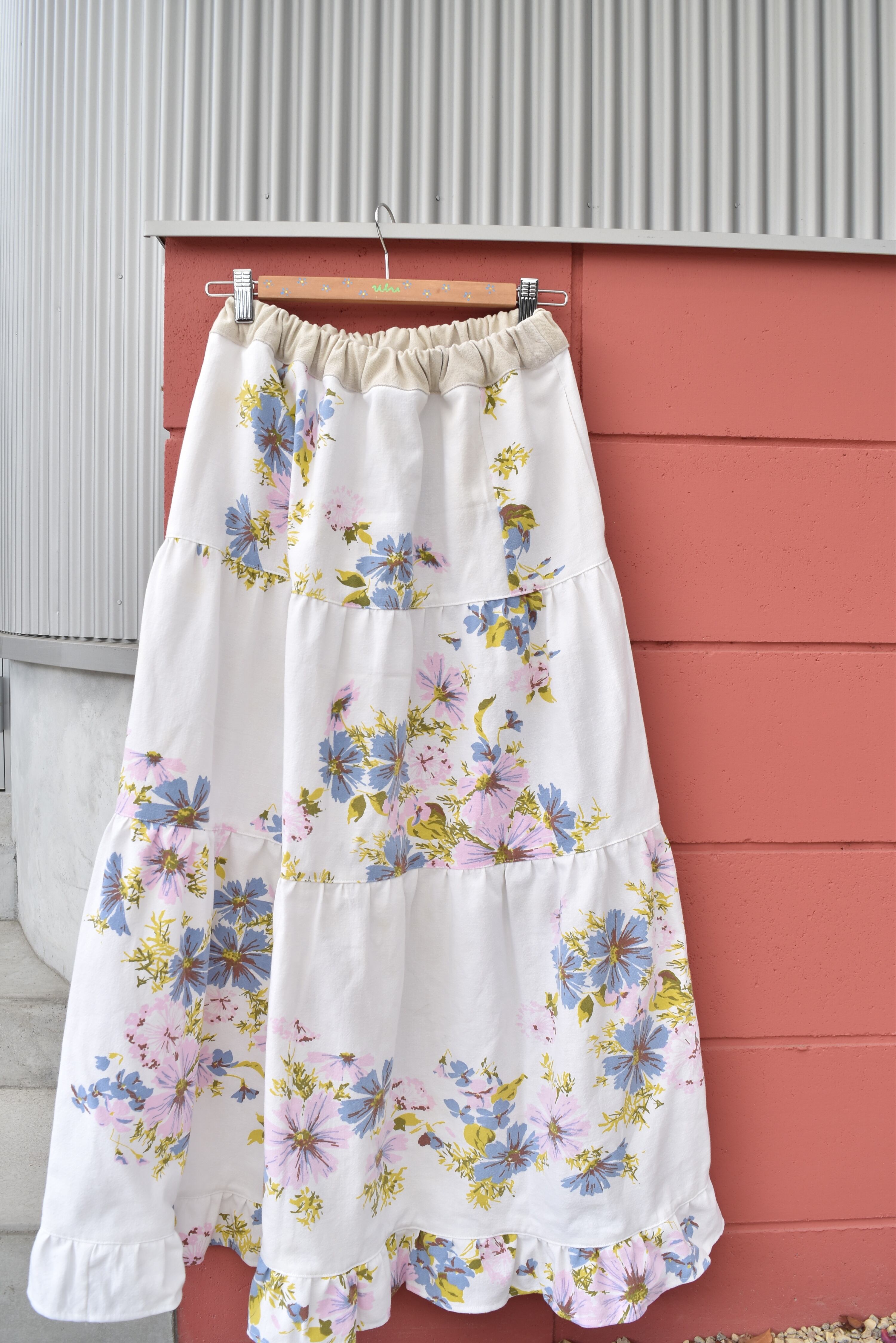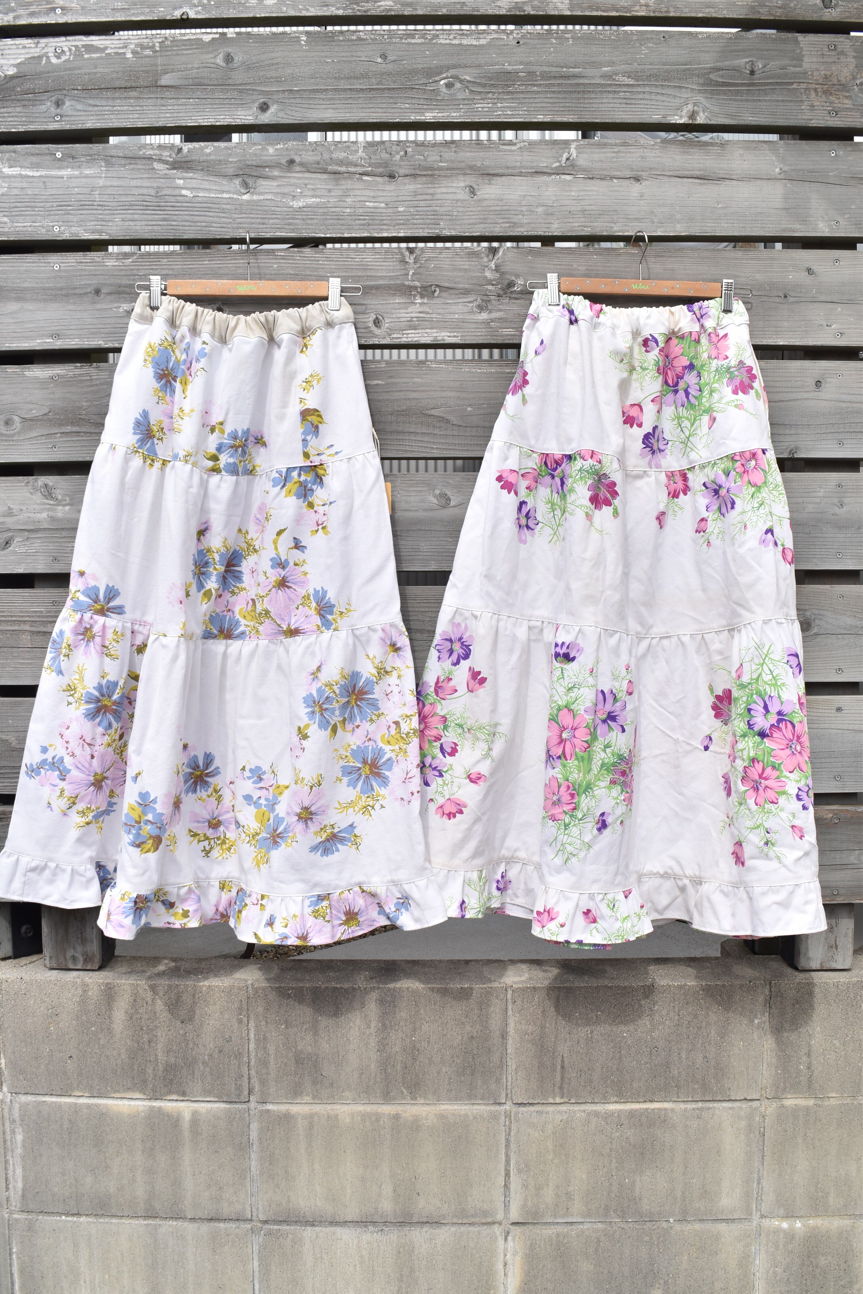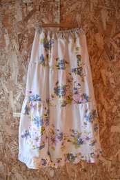 ビンテージのテーブルクロスを使用して製作したフリルスカート。柔らかいコットン素材で春とっても使いやすいアイテムになってます◎