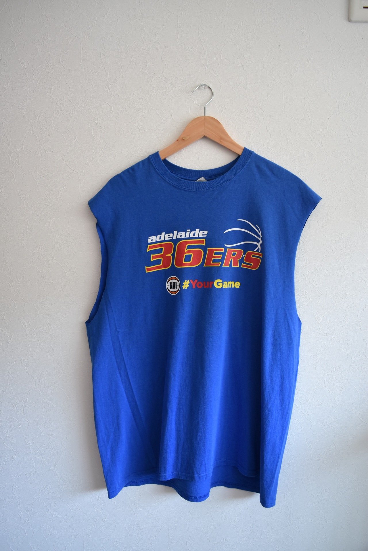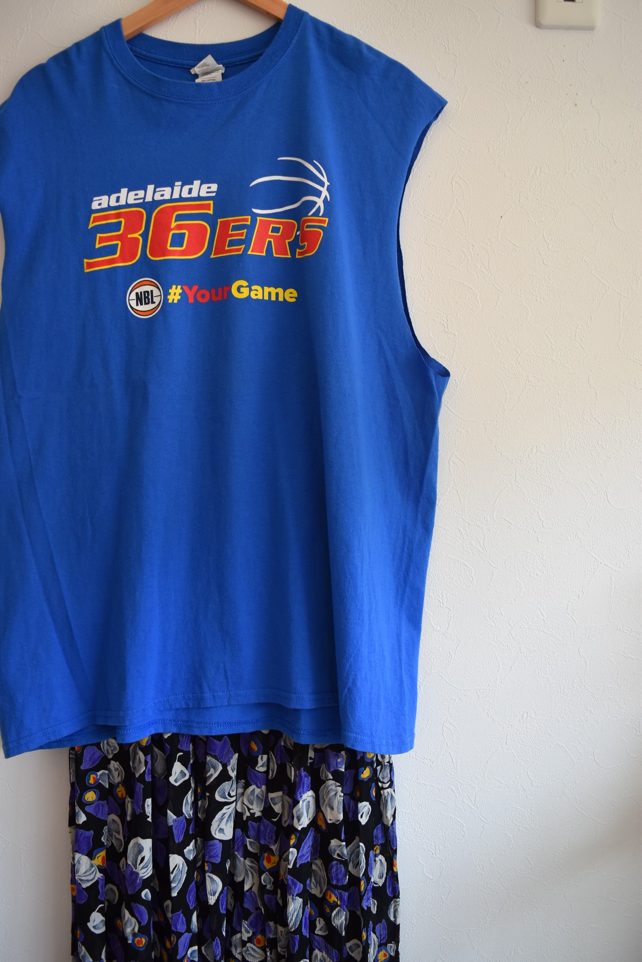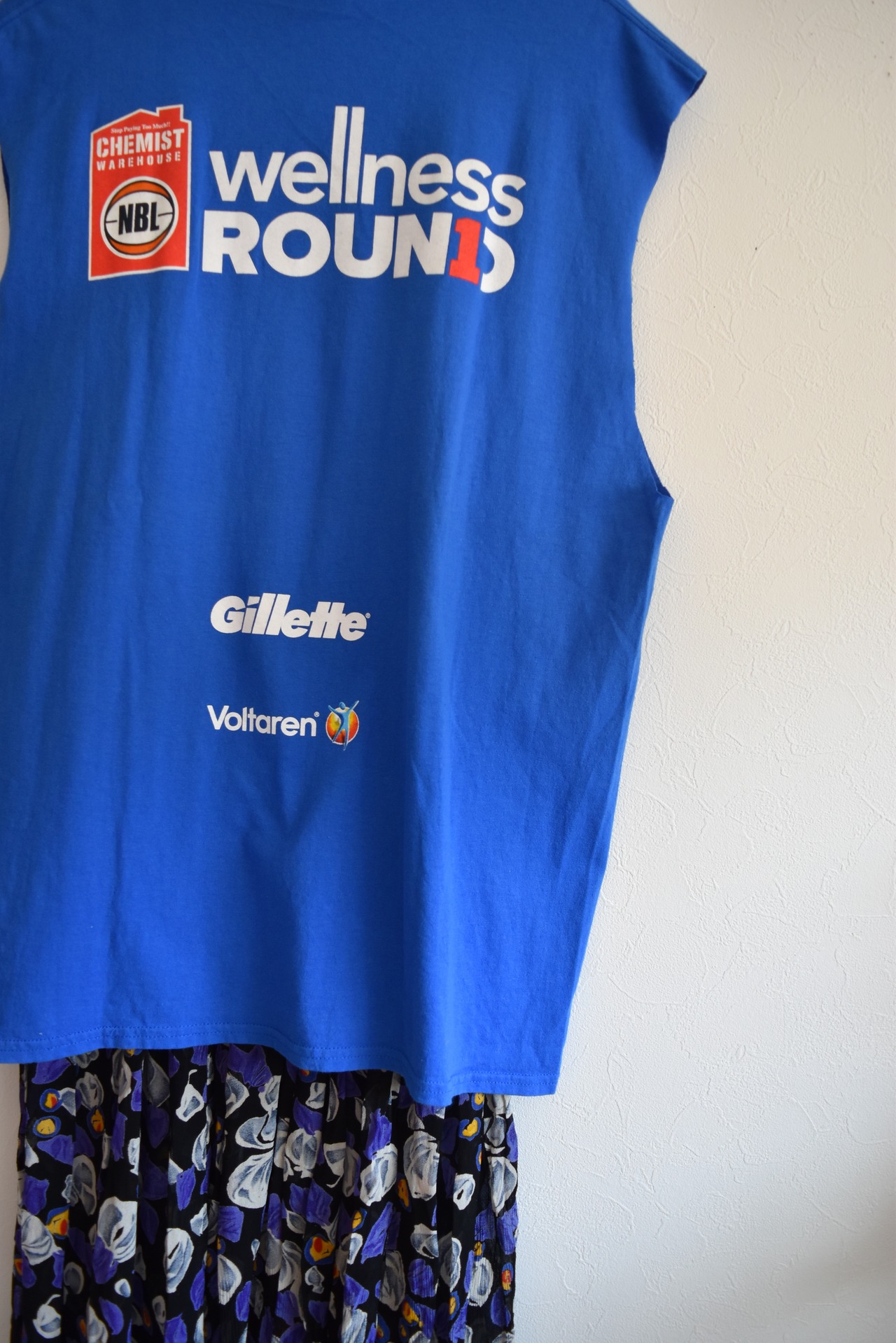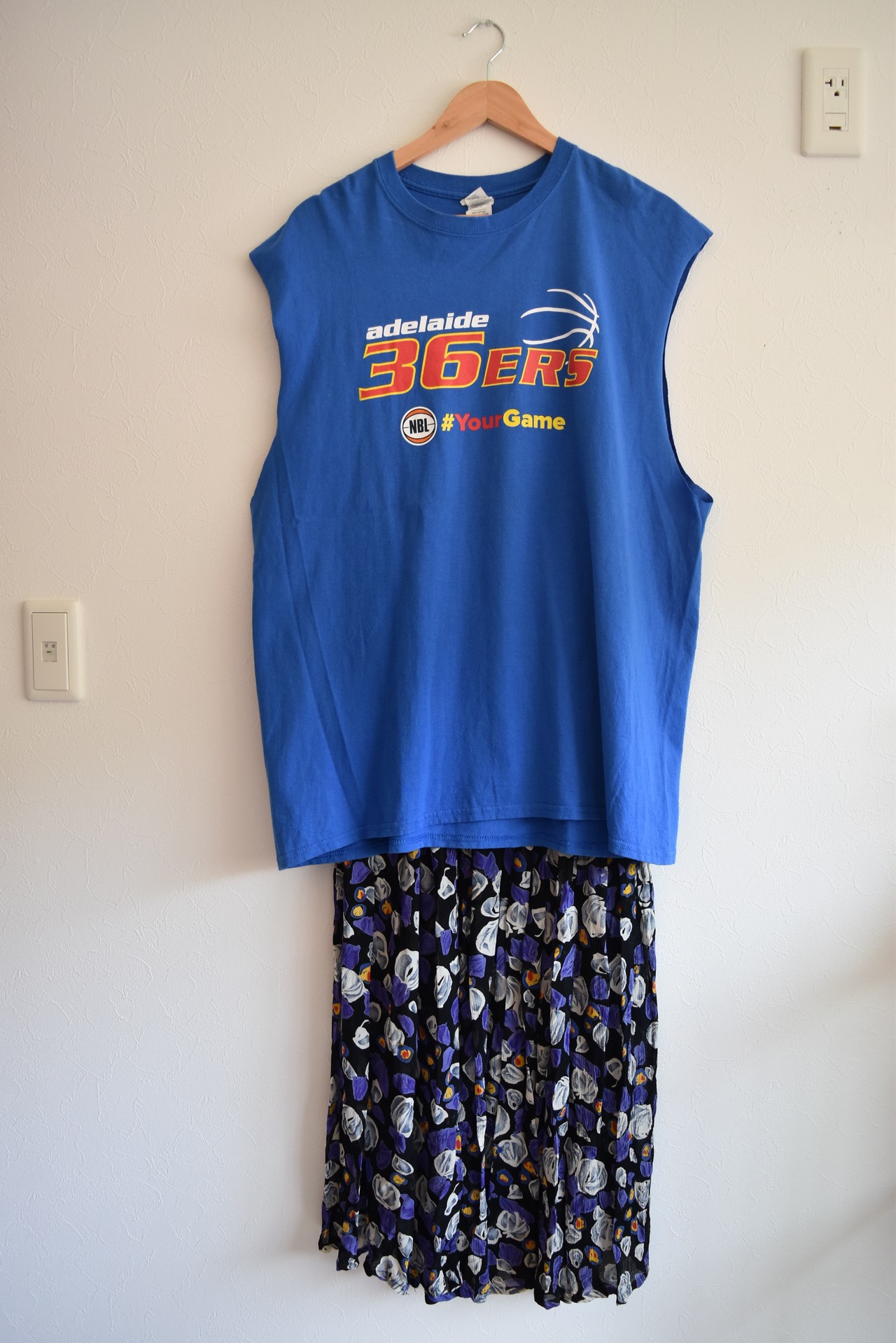 綺麗なブルーの企業系Tをノースリーブにリメイクしました。透け感のあるスカートと合わせて可愛らしくコーデするのがオススメです!